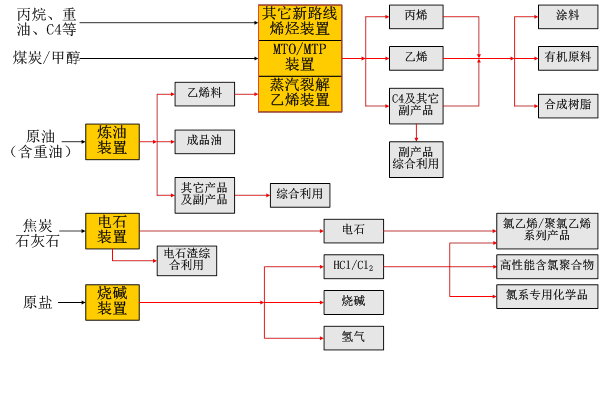 煉油乙烯:煉油(含重油加工)、烯烴(乙烯、丙烯等)、煉化副產品綜合利用(碳四及碳五深加工等)、基本有機原料、合成樹脂、涂料等;