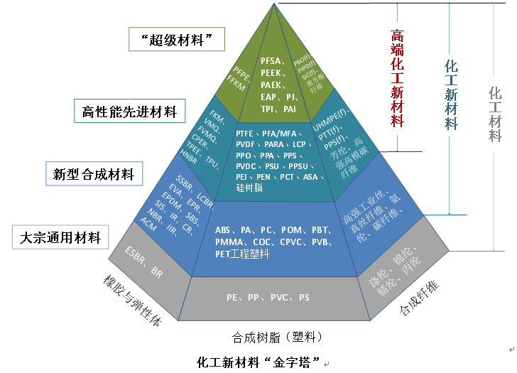 新材料產(chǎn)業(yè)是推進《中國制造2025》要優(yōu)先發(fā)展兩個核心基礎(chǔ)產(chǎn)業(yè)之一,而化工新材料產(chǎn)業(yè)在新材料產(chǎn)業(yè)中占據(jù)主要地位。化工新材料已成為化工行業(yè)轉(zhuǎn)型升級的主要方向和增長的主要動力,我國化工新材料產(chǎn)業(yè)正處在由“金字塔”底層向中上層邁進的關(guān)鍵時期。緊密跟蹤性能好、技術(shù)新、價值高的產(chǎn)品,特別是“金字塔”中上部的新材料產(chǎn)品,是未來十年捕捉產(chǎn)業(yè)發(fā)展先機的關(guān)鍵。