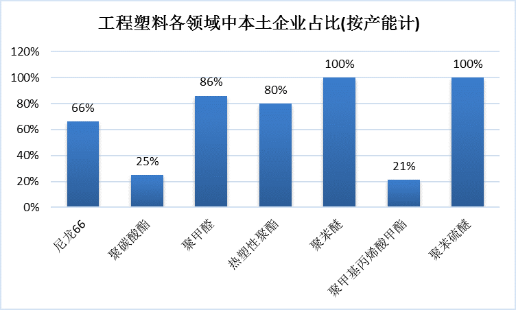 隨著產業鏈的延伸及自主技術的開發,國內已涌現一批較具實力的本土企業,如中煤神馬、云天化、儀征化纖、南通星辰、藍山屯河、江陰和時利、浙鐵大風、魯西化工、蘇州雙象、藍星芮城、浙江新和成、張家港新盛、金發科技等,全行業本土企業約50家。下圖表為我國工程塑料各領域中本土企業占比及主要企業情況。在聚酰胺66(PA66)、聚甲醛(POM)、熱塑性聚酯PBT領域,本土企業生產能力占其各領域的比重分別達到66%、86%、80%,較十年前有很大變化;由于技術難度較大,在聚碳酸酯(PC)和聚甲基丙烯酸(PMMA)領域,本土企業比例僅占25%、21%,特別是聚碳酸酯市場容量較大,國內企業仍有很大替代發展機會。聚苯硫醚等特種工程塑料,由于價格高、市場容量相對較小,一直以來國外企業對我國實現封鎖,基本不轉讓技術,因此在該領域,完全是國內企業依靠自主開發建成裝置。