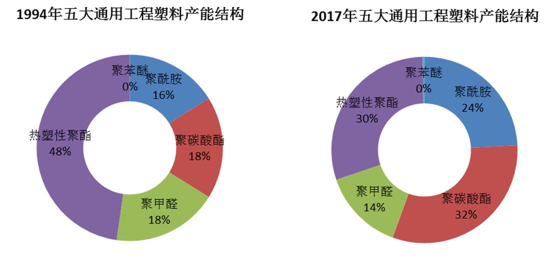 從工程塑料產品結構來看,目前聚碳酸酯的產能最大,占合計產能的32%;其次是聚酰胺工程塑料、熱塑性聚酯PBT分別占30~32%左右;聚甲醛占14%;聚苯醚的產能長期保持在萬噸水平,占比較小。下圖為1994年2017年國內五大通用工程塑料產能結構情況。與上世紀九十年代相比,聚碳酸酯生產增長較快,但生產仍以外資企業占主導,國內企業話語權仍較低。聚甲醛由于引進技術雷同,在2010年前后集中建成一批裝置,其產品檔次不高,均在中低市場參與競爭,因此新建裝置利用水平普遍不高,自給率50%左右,每年還需進口30萬噸左右。可喜的是,隨著我國自主技術發展和引進技術吸收再創新,在PBT領域,我國本土企業已占有一席之地,生產規模和產品質量均有較大程度提高,在滿足國內市場的同時已開始出口。我國是紡織品生產和出口大國,因此國內聚酰胺裝置以生產纖維級產品為主,同時由于受工藝技術限制,國內聚酰胺工程塑料品種產量占比不到其聚合產能的10%,國內汽車、電子領域需要的聚酰胺以進口和外資產品為主。