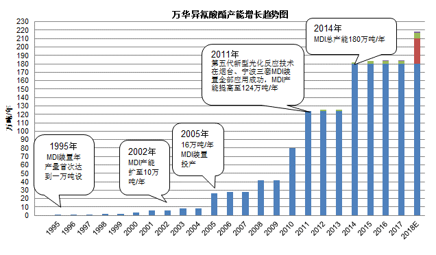 隨著MDI技術的創新突破,萬華化學迅速成長為世界第一大MDI生產企業。2011年,第五代新型光化反應技術成功在煙臺、寧波三套MDI裝置全部應用成功,MDI總產能從80萬噸提高至124萬噸/年。2014年,萬華煙臺工業園老廠搬遷異氰酸酯一體化項目全線一次投產成功并生產出合格的MDI產品,MDI總產能達到180萬噸/年,穩居世界首位。此外,萬華于2016年完成了對匈牙利最大化工公司寶思德100%股權的收購,成功實現了我國異氰酸酯行業“走出去”的第一步。