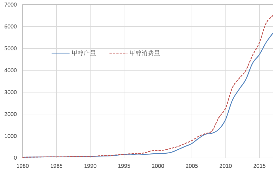 我國(guó)甲醇生產(chǎn)起始于20世紀(jì)50年代末期,發(fā)展了有中國(guó)特色的合成氨聯(lián)產(chǎn)甲醇的生產(chǎn)技術(shù),依附于中、小型氨廠,規(guī)模很小。改革開放前,中國(guó)的甲醇年產(chǎn)量?jī)H20萬(wàn)噸。隨后開始出現(xiàn)了獨(dú)立甲醇項(xiàng)目的建設(shè),同時(shí)在中型、大型氮肥廠的建設(shè)的帶動(dòng)下,聯(lián)產(chǎn)甲醇規(guī)模有所上升,但總體增長(zhǎng)非常緩慢。進(jìn)入21世紀(jì)以來(lái),獨(dú)立甲醇的大型化和規(guī)?;茝V,使得甲醇產(chǎn)業(yè)步入快速發(fā)展的軌道,生產(chǎn)規(guī)模和技術(shù)水平都有大幅提高,至2017年產(chǎn)量達(dá)到5700萬(wàn)噸。目前中國(guó)已經(jīng)成為國(guó)際市場(chǎng)最主要的甲醇生產(chǎn)國(guó)和消費(fèi)國(guó)。改革開放以來(lái)的甲醇產(chǎn)量和消費(fèi)量逐年變化情況如下圖。