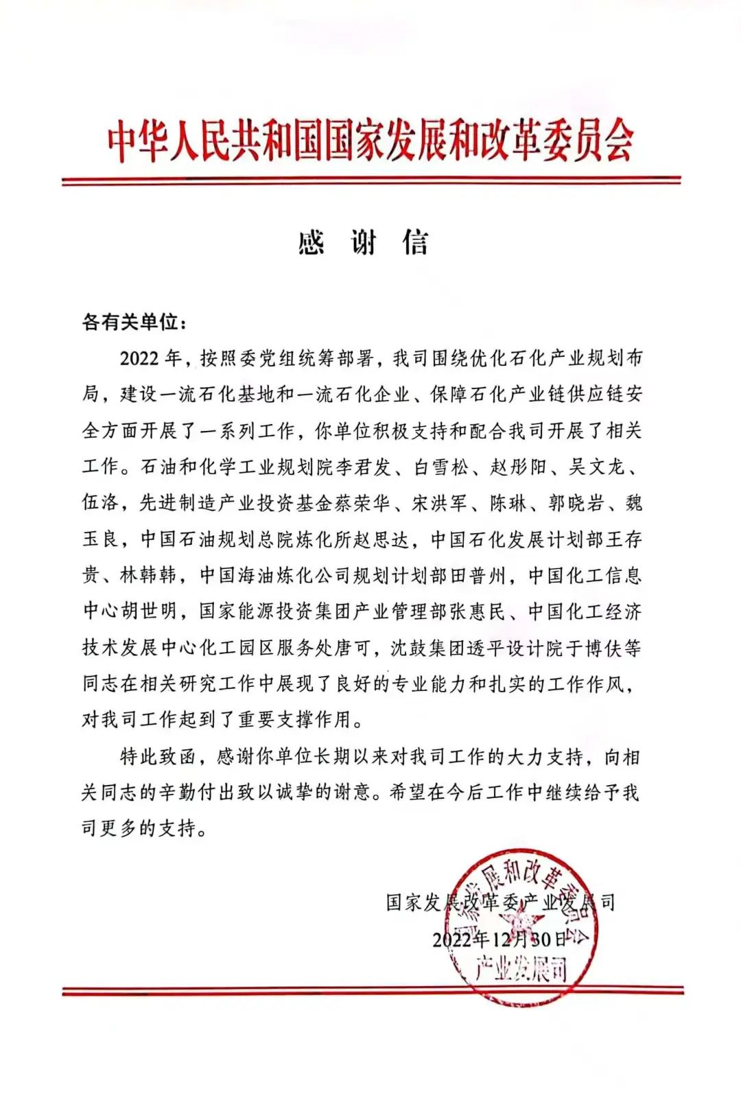 2022年是實施“十四五”規(guī)劃的關(guān)鍵之年,我們國家已經(jīng)邁入一個新時代、新征程,面對新任務(wù)、新機遇、新挑戰(zhàn),奮進正當(dāng)時。辭舊迎新之際,國家發(fā)展和改革委員會產(chǎn)業(yè)發(fā)展司發(fā)來感謝信,感謝一年來石油和化學(xué)工業(yè)規(guī)劃院為產(chǎn)業(yè)發(fā)展司相關(guān)工作開展做出的積極貢獻,感謝李君發(fā)院長和白雪松、趙彤陽、吳文龍、伍洛同志在相關(guān)研究工作中起到的重要作用。