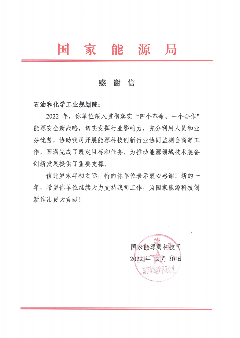 我院利用自身專業特長和技術力量,長期在石化化工行業能源監測、煤炭深加工產業發展、能源領域科技創新等方面為國家能源局科技司提供技術支撐,得到高度認可。新年之際,科技司發來感謝信。我院將一如既往,做好國家相關部委的參謀,為促進相關行業實現高質量發展做出應有貢獻。