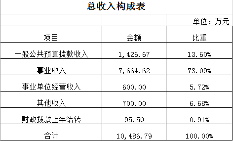 2023年收入預算10486.79萬元,其中上年結轉95.5萬元,占0.91%;一般公共預算撥款收入1426.67萬元,占13.6%;事業(yè)收入7664.62萬元,占73.09%;事業(yè)單位經(jīng)營收入600萬元,占5.72%;其他收入700萬元,占6.68%。