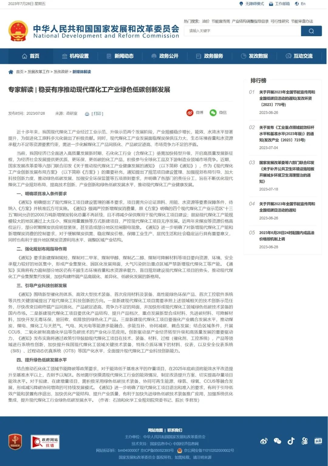 7月27日,國家發(fā)改委網(wǎng)站發(fā)布《國家發(fā)改委等部門關(guān)于推動現(xiàn)代煤化工產(chǎn)業(yè)健康發(fā)展的通知》。28日,發(fā)表李君發(fā)院長的解讀文章《穩(wěn)妥有序推動現(xiàn)代煤化工產(chǎn)業(yè)綠色低碳創(chuàng)新發(fā)展》。