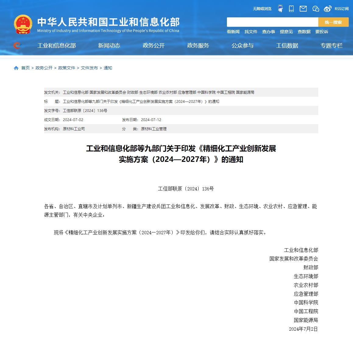 為貫徹國家有關規(guī)劃重點任務,引導精細化工產(chǎn)業(yè)高端化、綠色化、智能化發(fā)展,近日,工業(yè)和信息化部、國家發(fā)展改革委、財政部、生態(tài)環(huán)境部、農(nóng)業(yè)農(nóng)村部、應急管理部、中國科學院、中國工程院、國家能源局等9部門聯(lián)合發(fā)布《精細化工產(chǎn)業(yè)創(chuàng)新發(fā)展實施方案(2024—2027年)》(以下簡稱《實施方案》)。
