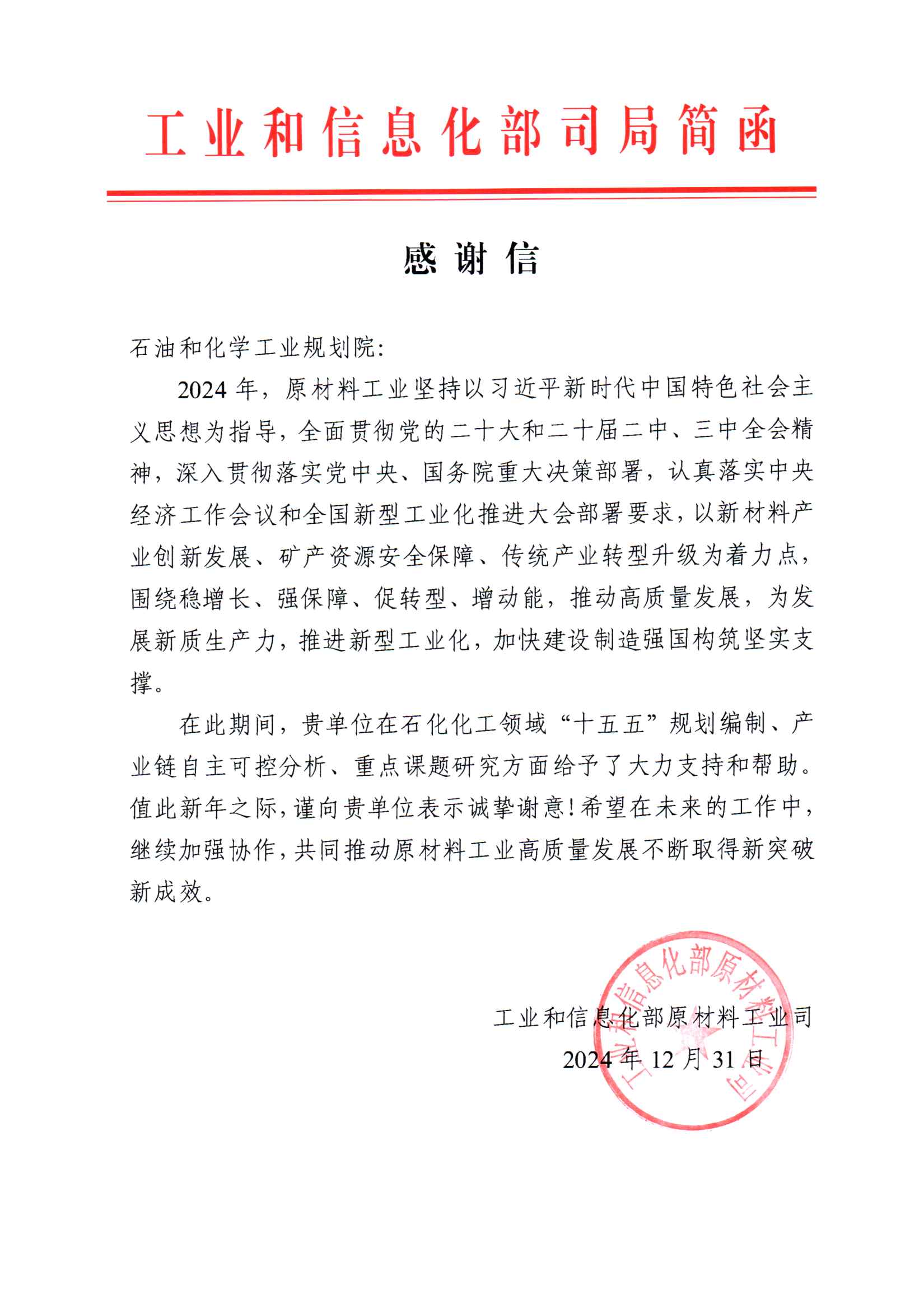 2024年,石油和化學工業規劃院積極發揮國家智庫的作用,支撐工業和信息化部原材料工業司在石化化工行業“十五五”規劃研究、精細化工產業創新發展、產業鏈自主可控分析等方面開展了一系列工作,獲得了工業和信息化部原材料工業司的高度認可。