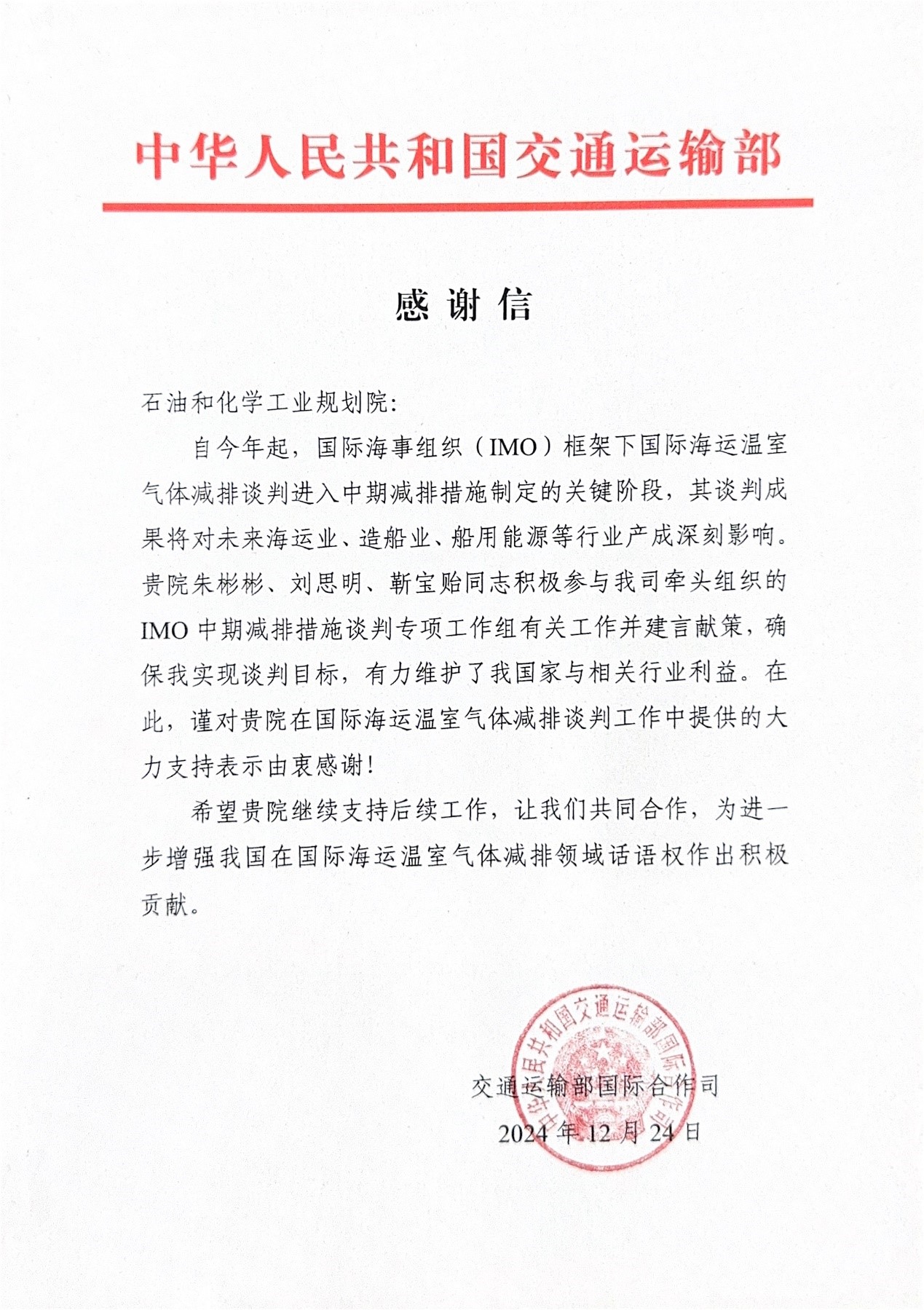 2024年,石油和化學工業規劃院積極發揮國家智庫的作用,支撐交通運輸部國際合作司國際海事組織中期減排措施談判專項工作組開展相關工作,積極提出基于能源行業角度的相關研究成果及觀點,獲得了交通運輸部國際合作司的高度認可。
