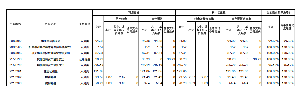如上圖所示,我單位2024年度預(yù)算執(zhí)行進度為97.85%,情況良好。除“離退休費(完成率99.62%)”和“其他國有資產(chǎn)監(jiān)管支出-人員類(完成率96.17%)”兩個項目,因年末新增追加投資已無法按時支付外,原預(yù)算計劃完成率為100%。